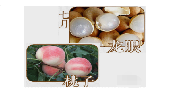 七月份应季水果是 龙眼、桃子,龙眼味甘甜,性温,具有养血安神的作用,滋补强体,润肤美容,不易多吃,易上火。桃子性平,具有滋养作用含铁量较高,有润燥活血作用,体内偏热者少吃。