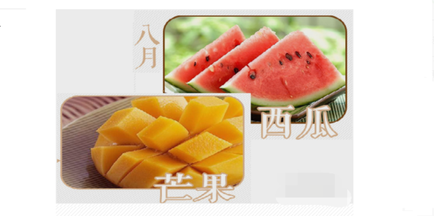 八月份应季水果是 西瓜、芒果,西瓜是夏季解渴解暑的最佳果品,具有清热止渴、利尿消肿等功效。易腹泻者要少吃。芒果性平,有益脾胃,有防止心血管疾病,降低胆固醇之功效。