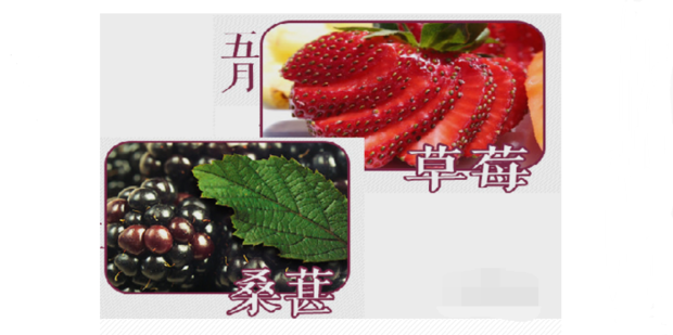 五月份应季水果是 草莓、桑葚,草莓含有丰富的叶酸,有益于心脏健康和改善消化道健康,还具有抗癌的保健功能。桑葚性寒,补血养颜,健脾胃,助消化,含有鞣酸、脂肪酸等营养成分。