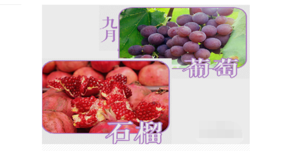 九月份应季水果是 葡萄、石榴,葡萄味甜酸,对滋补肝肾有益,益气补血,之中的糖分比较容易被人吸收,有很好的抗衰老作用。石榴,性温,有止血止泻作用 ,有助于消化,有助于软化血管、降血脂、降胆固醇的作用。