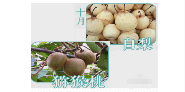 十月份应季水果是 白梨、猕猴桃,白梨性凉,润喉清热,润肺解燥,化痰解酒,还有保护肝脏的作用是秋季水果之王。猕猴桃微酸,含有丰富的维生素E和C,预防口腔溃疡,增强抵抗力,美容抗衰老。