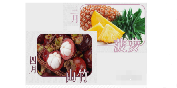 三月份应季水果是 菠萝、四月份应季水果是山竹,菠萝甘甜爽脆,含有维生素B较多,具有营养皮肤,消除紧张,减少疲劳,增强肌体的免疫能力。山竹具有清凉解热的作用,含钙、磷、维生素B和C等多种元素,对肌体有很好的补养作用,虚寒身体不宜多吃。