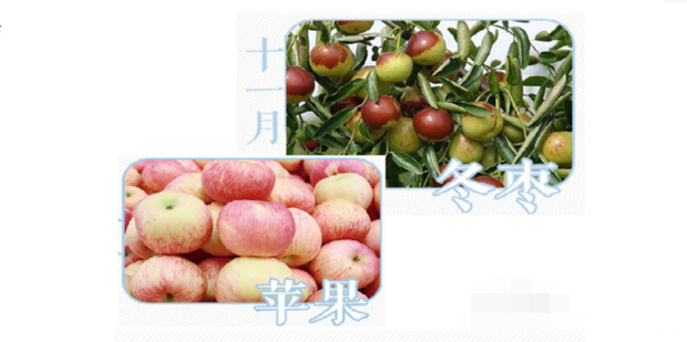 十一月份应季水果是 冬枣、苹果,冬枣甘甜爽脆,性平含有维生素及多种人体需要的微量元素,具有补血护肝作用,还可以抗动脉硬化,对维持血管弹性有一定的好处。苹果更是含维生素和其它人体需要的镁、铁、硫、锌等多种微量元素。俗话有说:“一天一苹果,不找医生开处方”。还具有嫩肤美容的作用。也有果中之王的美称。