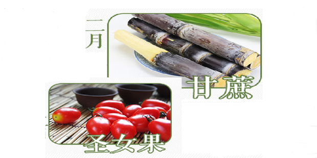 二月份应季水果是 甘蔗、圣女果,甘蔗汁甜解渴、含糖量极为丰富,润肺润喉,是冬季水果佳品。圣女果含有番茄红素,具有补血养血之功效,是增进食欲、延缓衰老的佳品。