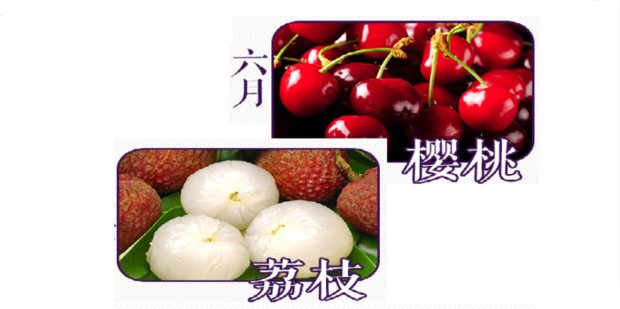 六月份应季水果是 樱桃、荔枝,樱桃性温,具有补气调中的功效,健脾开胃,美容养颜。荔枝同樱桃一样地美容健脾作用,还可补脑健身,含有丰富的维生素成分,可增加肌体的免疫能力。这两种水果都不易多吃,易上火。