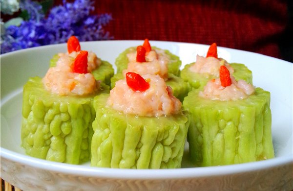 鲜虾酿苦瓜原料:苦瓜、鲜虾、玉米淀粉适量。
